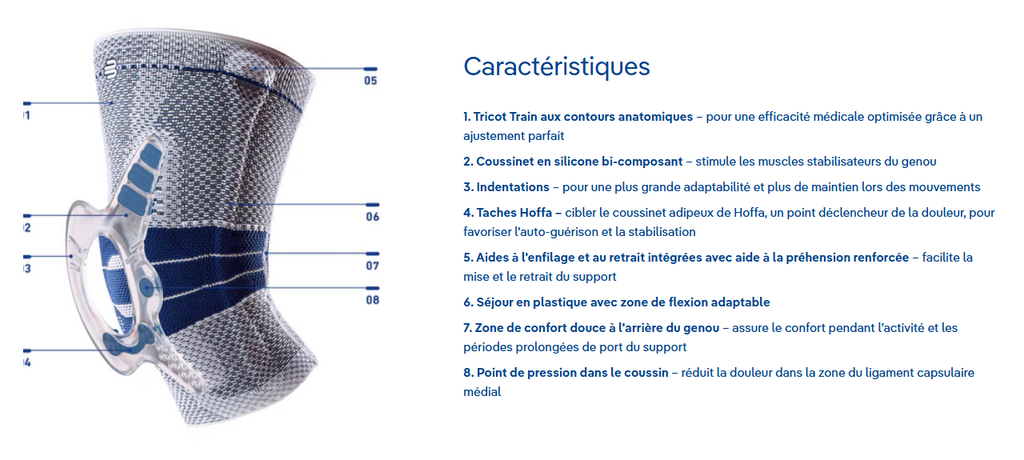 Dans l'arthrose, il est important de garder la douleur sous contrôle mais en même temps de mobiliser le genou afin de ralentir la progression de la maladie. Le GenuTrain® A3 aide en fournissant un soutien et un soulagement ciblés. Lorsque vous bougez, la genouillère exerce un massage par pression alternée, ce qui favorise la réduction du gonflement. Son coussinet en forme d'étoile stimule les muscles stabilisateurs des articulations et masse les zones douloureuses typiques à l'intérieur du genou pour soulager l'inconfort. En plus des éléments de massage, ce coussin flexible possède des encoches encastrées afin qu'il reste toujours dans une position sécurisée même lorsque le genou est plié.