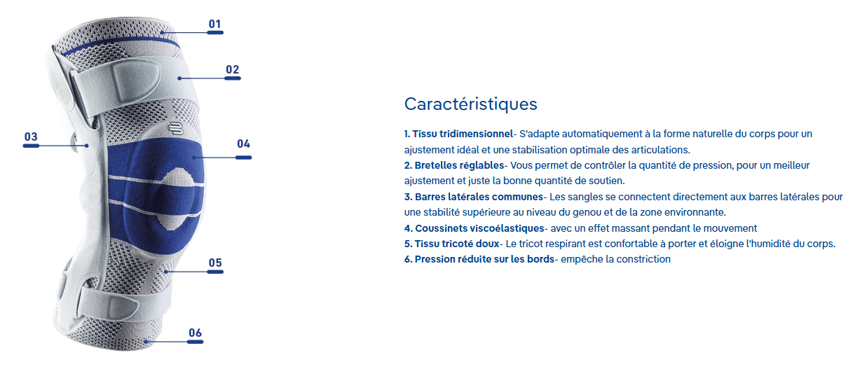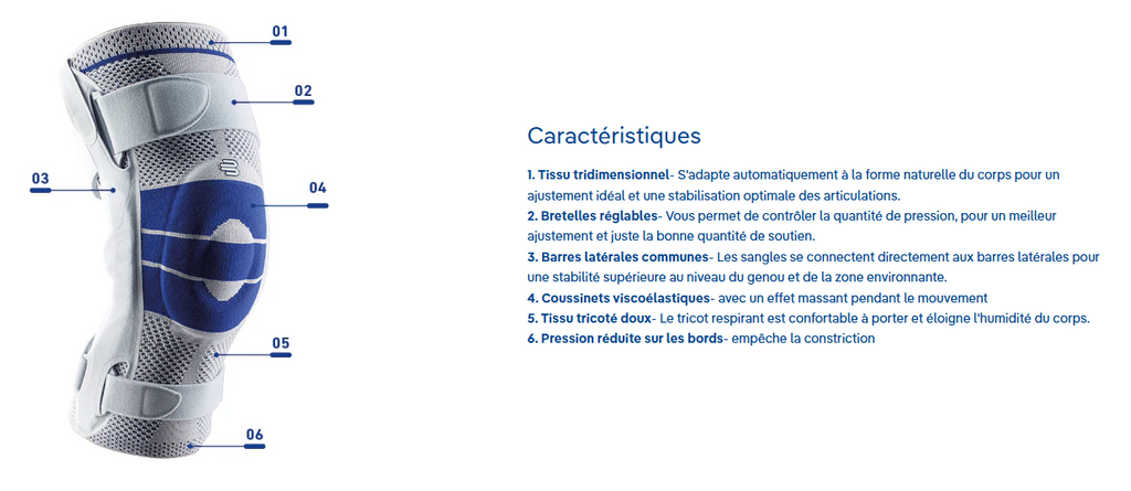 L'orthèse orthopédique GenuTrain® S avec attelles articulaires latérales soutient l'articulation du genou en cas d'indications de légère instabilité, d'arthrite ou d'arthrose du genou. Un coussin de pression (coussin) intégral en forme d'anneau entoure la rotule, tandis que l'interaction du tricot et du coussinet fournit un massage par compression intermittent, activant ainsi la musculature et stimulant le processus de guérison. La combinaison de barres articulaires et d'un système de sangles dans le GenuTrain S offre un soutien passif supplémentaire pour le genou.