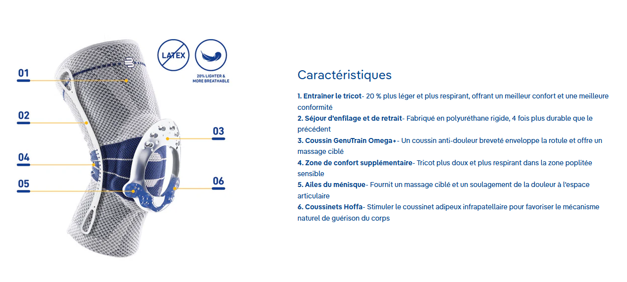 L'orthèse GenuTrain® stabilise et décharge l'articulation du genou grâce à son tricot de compression tridimentionnel et sa pelote Omega viscoélastique. Ensemble, ils massent les tissus lors des mouvements. Cela accélère la résorption des œdèmes et des épanchements, soulage la douleur et active la musculature. L'orthèse garantit une position sûre et un grand confort. Grâce à l'aide à l'enfilage intégrée, elle est facile à mettre.