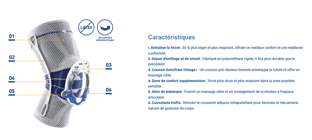 Le nouveau coussinet Omega+ amélioré de GenuTrain® protège et enveloppe la rotule, stabilisant l'articulation et massant les tissus environnants pendant le mouvement. Cette fonctionnalité renforce l'effet analgésique et sensorimoteur du support en stimulant deux zones sensibles du genou : le coussinet adipeux de Hoffa et la base du ménisque. Dans ces points Hoffa et ailes de ménisque, le matériau en gel viscoélastique intègre des picots de massage flexibles, fournissant des stimuli sélectifs supplémentaires pendant le mouvement pour contrecarrer les habitudes correctives non naturelles.