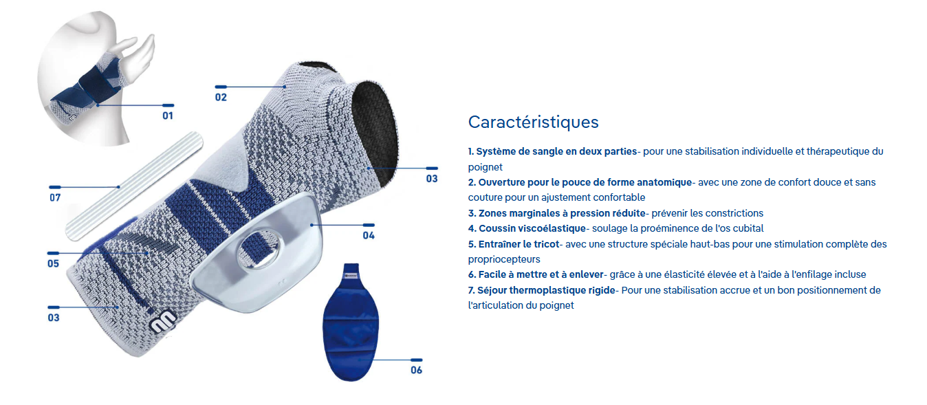 ManuTrain® soulage et stabilise le poignet grâce à sa compression circulaire. Deux pelotes protègent les nerfs et vaisseaux sanguins d'une pression excessive. Lors du mouvement, l'orthèse soulage la douleur et active la musculature. En cas de nécessité, un renfort intérieur et une bande auto-agrippante augmentent l'effet stabilisateur. Leur forme anatomique et la zone sans coutures entre le pouce et l'index garantissent un grand confort et réduisent les irritations.